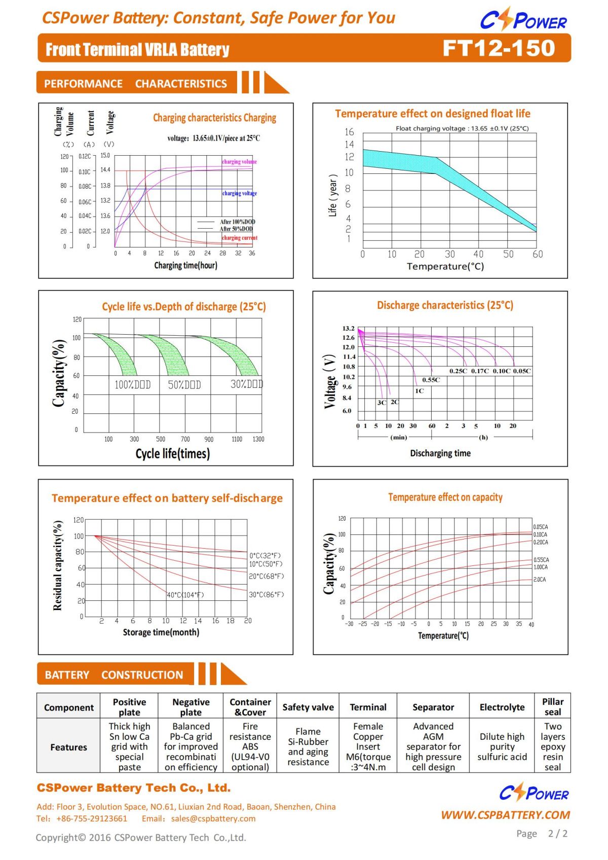 | Nominal Capacity @ 25℃ | 10 hour rate@15.0A,10.8V | 150Ah | |